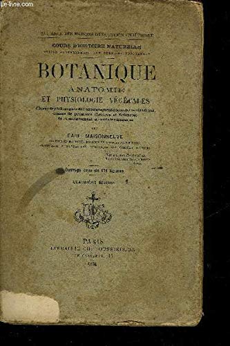 R300000375. BOTANIQUE - ANATOMIE ET PHYSIOLOGIE VEGETALES / 4E EDITION.. 1894. In-8. Broché. Etat d'usage, 1er plat abîmé, Coiffe en tête abîmée, Quelques rousseurs. XII + 305 + 16 pages - quelques rousseurs sans réelle conséquence sur la lecture - nombreuses figures en noir et blanc dans le texte - petit manque sur le 1er plat.. . . . Classification Dewey : 580-Botanique