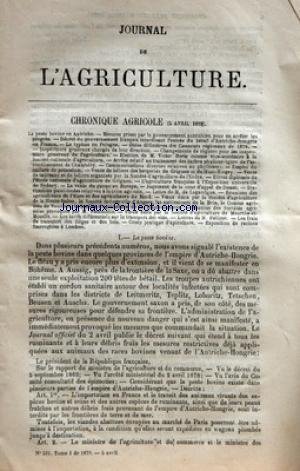 CHRONIQUE AGRICOLE - LA PESTE BOVINE EN AUTRICHE - MESURES PRISES PAR LE GOUVERNEMENT AUTRICHIEN POUR EN ARRETER LES PROGRES - DECRET DU GOUVERNEMENT FRANCAIS INTERDISANT LÔÇÖENTREE DU BETAIL DÔÇÖAUTRICHE-HONGRIE EN FRANCE - LA TYPHUS EN POLOGNE - DATES DEFINITIVES DES CONCOURS REGIONAUX DE 1879 - INSPECTEURS GENERAUX CHARGES DE LEUR DIRECTION - CHANGEMENTS DE REGIONS POUR LES INSPECTEURS GENERAUX DE LÔÇÖAGRICULTURE - ELECTION DE M VICTOR BORIE COMME VICE-SECRETAIRE A LA SOCIETE NATIONALE DÔÇÖAGRICULTURE - ARRETE RELATIF AU TRAITEMENT DES TACHES PHYLLOXERIQUES DE LÔÇÖARRONDISSEMENT DE CHAMBERY - COMMUNICATIONS DIVERSES RELATIVES AU PHYLLOXERA - EMPLOI DU SULFURE DE POTASSIUM - VENTE DE BELIERS DES BERGERIES DE GRIGNON ET DU HAUT TINGRY - VENTE DE TAUREAUX ET DE BELIERS ORGANISEE PAR LA SOCIETE DÔÇÖAGRICULTURE DE LÔÇÖINDRE - ELEVES DIPLOMES DE LÔÇÖECOLE NATIONALE DÔÇÖAGRICULTURE DE GRIGNON - LÔÇÖAGRICULTURE FRANCAISE A LÔÇÖEXPOSITION UNIVERSELLE DE SYDNEY - LA VENTE DU GUANO EN EUROPE - JUGEMENT DE LA COUR DÔÇÖAPPEL DE DOUAI - DISCUSSIONS PASSIONNEES RELATIVES A LA CRISE AGRICOLE - LETTRE DE M DE LAGARRIGUE - REUNIONS DES AGRICULTEURS DE LÔÇÖEURE ET DES AGRICULTEURS DU NORD - VOEUX EMIS PAR LA SOCIETE DÔÇÖAGRICULTURE DE LA HAUTE-SAONE LA SOCIETE INDUSTRIELLE DÔÇÖANGERS LES CULTIVATEURS DE LA BRIE LE COMICE AGRICOLE DE VOUZIERS LA SOCIETE DÔÇÖAGRICULTURE DE LA HAUTE GARONNE - REUNION DES SOCIETES AGRICOLES PROVOQUEE PAR M ESTANCELIN - VOEUX EMIS PAR LA SOCIETE DÔÇÖAGRICULTURE DE MEURTHE ET MOSELLE - LES TARIFS DIFFERENTIELS SUR LE TRANSPORT DES VINS - LETTRES DE M PELLICOT - LES FRAIS DE TRANSPORT DES LIEGES ET DES BOIS - COURS PRATIQUE DÔÇÖAPICULTURE - EXPOSITION DE RACINES FOURRAGERES A LONDRES - I LA PESTE BOVINE - CONSTRUCTION DES BATIMENTS RURAUX