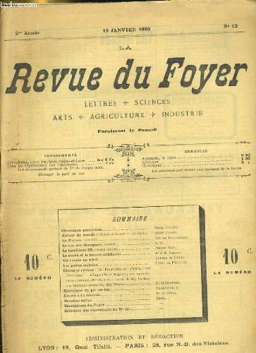 RO20130520. LA REVUE DU FOYER. LETTRES, SCIENCES, ARTS, AGRICULTURE, INDUSTRIE. 2e annee N° 12. LE NEZ DES GEORGIENS, LE SUCRE ET LE BEURRE ARTIFICIELS, UN ROMAN EN 1915.... 19 janvier 1889. In-4. Broché. Bon état, Couv. convenable, Dos satisfaisant, Intérieur frais. Paginé de 178 à 192. Texte sur 3 colonnes.. . . . Classification Dewey : 70-Journalisme, édition. Journaux