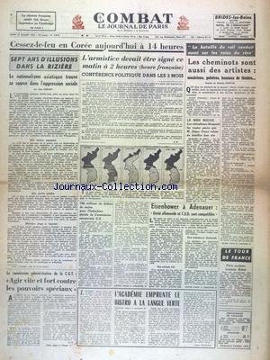CESSEZ-LE-FEU EN COREE A 14 HEURES - 7 ANS D'ILLUSIONS DANS LA RIZIERE PAR FABIANI - LE MIDI BOUGE - LES VITICULTEURS BLOQUENT LES ROUTES - EISENHOWER A ADENAUER - L'ACADEMIE EMPRUNTE LE BISTRO A LA LANGUE VERTE PAR FRANCOIS