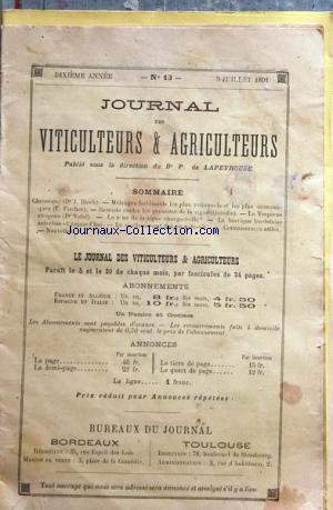 CHRONIQUE DU DR BLOCH - MELANGES FERTILISANTS LES PLUS RATIONNELS ET LES PLUS ECONOMIQUES PAR FISCHER - REMEDE CONTRE LES PARASITES DE LA VIGNE PAR QUANTIN - LE VESPERUS STREPENS PAR VIDAL - LA BARRIQUE BORDELAISE AUTREFOIS ET AUJOURD'HUI - LE VIEILLISSEMENT DES EAUX-DE-VIE