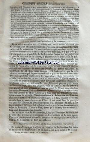 CHRONIQUE AGRICOLE - NOMINATION DE M TEISSERENC DE BORT COMME MINISTRE DE LÔÇÖAGRICULTURE ET DU COMMERCE ÔÇô LES CONSEQUENCES DE LA CRISE QUE NOUS VENONS DE TRAVERSER ÔÇô NOMINATION DE M EDMOND TEISSERENC DE BORT AU POSTE DE CHEF DE CABINET DU MINISTRE DE LÔÇÖAGRICULTURE ÔÇô REUNION DE LA DIRECTION DES FORETS AU MINISTRE DE LÔÇÖAGRICULTURE ET DU COMMERCE ÔÇô TRAVAUX DE M CHEVREUL SUR LE JARDIN FRUITIER DU MUSEUM ÔÇô LÔÇÖHORTICULTURE ET LES SCIENCES NATURELLES ÔÇô NOMINATION DE M HOUSSARD AU GRADE DE CHEVALIER DE LA LEGION DÔÇÖHONNEUR ÔÇô LE COMICE AGRICOLE DE THIONVILLE ÔÇô LETTRE DE M SCHNEIDER ÔÇô LA PESTE BOVINE ÔÇô ARRETES PRIS PAR LE GOUVERNEMENT BELGE ET CELUI DU GRAND-DUCHE DE LUXEMBOURG ÔÇô LA CONTAGIOSITE DE LA PESTE BOVINE PAR LES MOUTONS ÔÇô LETTRE DE M ZUNDEL ÔÇô DEVOIRS DE LÔÇÖADMINISTRATION POUR SAUVEGARDER LE BETAIL FRANCAIS ÔÇô LE FONCTIONNEMENT DU SERVICE SANITAIRE A LÔÇÖINTERIEUR ÔÇô PROPOSITION DE M TANGUY ÔÇô LE RAPPORT SUR LE BUDGET DU MINISTERE DE LÔÇÖAGRICULTURE ET DU COMMERCE ÔÇô LES CONCOURS REGIONAUX DE 1878 ÔÇô CONCLUSIONS DU RAPPORT DE LA COMMISSION DU BUDGET ÔÇô INCERTITUDE DE LA SITUATION ÔÇô LÔÇÖENSEIGNEMENT AGRICOLE DANS LES ECOLES NORMALES PRIMAIRES ÔÇô EXTRAIT DU RAPPORT DE M BARDOUX SUR LE BUDGET DU MINISTERE DE LÔÇÖINSTRUCTION PUBLIQUE ÔÇô LE PHYLLOXERA ÔÇô PUBLICATIONS DIVERSES SUR LES TRAVAUX DE LÔÇÖANNEE 1877 ÔÇô NECROLOGIE ÔÇô MORT DE M GINTRAC ÔÇô LE 2E VOLUME DU TRAITE DE ZOOTECHNIE DE M SANSON ÔÇô CONCOURS DÔÇÖANIMAUX GRAS A TROYES ÔÇô SERICICULTURE ÔÇô LÔÇÖEDUCATION DES VERS A SOIE EN PLEIN AIR ÔÇô LES REBOISEMENTS EXECUTES EN 1878 ÔÇô SACRIFICES FAITS PAR LA DIRECTION DES FORETS ÔÇô LA VENTE DES MACHINES AGRICOLES ETRANGERES A PARIS ÔÇô I ÔÇô LE MINISTRE DE LÔÇÖAGRICULTURE ET DU COMMERCE ÔÇô II ÔÇô ADJONCTION DE LA DIRECTION DES FORETS AU MINISTERE DE LÔÇÖAGRICULTURE ÔÇô BIBLIOGRAPHIE AGRICOLE ET HORTICOLE