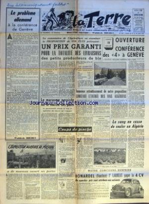 LE PROBLEME ALLEMAND A LA CONFERENCE DE GENEVE PAR WALDECK ROCHET - L'EXPOSITION AGRICOLE DE MOSCOU A DE NOUVEAU OUVERT SES PORTES - QUELQUES CHIFFRES SUR L'EXPOSITION - LA COMMISSION DE L'AGRICULTURE VA EXAMINER LA PROPOSITION DE NOS ELUS PREVOYANT UN PRIX GARANTI POUR LA TOTALITE DES LIVRAISONS DES PETITS PRODUCTEURS DE BLE - LES PRODUCTEURS DE LAIT RECLAMENT LE RESPECT DU PRIX INDICATIF - LE MARASME PERSISTE SUR LE MARCHE DES PORCS LE GOUVERNEMENT RETARDE LA MISE EN APPLICATION DES MESURES QUI S'IMPOSENT - COUPS DE PIOCHE PAS SI FOU QUE CA - PREMIERS OBJECTIFS DE BONN - GENERAL ET BOUCHER - LA CHALEUR DES COLONIALISTES - IMMENSE RETENTISSEMENT DE NOTRE PROPOSITION LIMITANT L'ENTREE DES VINS ALGERIENS - H THAMIER ET E CASTERA DEMANDENT L'INDEMNISATION TOTALE DES PLANTEURS DE TABAC SINISTRES LUNDI 18 JUILLET OUVERTURE DE LA CONFERENCE DES 4 A GENEVE - LE SANG NE CESSE DE COULER EN ALGERIE NOTRE CONCOURS SURPRISE BONARDEL VAUCLUSE 1ER LAUREAT GAGNE LA 4 CV