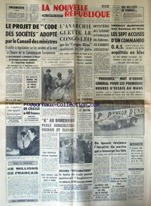 LE PROJET DE CODE DES SOCIETES ADOPTE - IL Y A 24 ANS DE GAULLE LANCAIT DE LONDRES SON APPEL HISTORIQUE - L'ANARCHIE GUERRE LE CONGO-LEO QUE LES CASQUES BLEUS QUITTENT LE 30 JUIN - TSCHOMBE - GIZENGA ET KALONDJI SERAIENT AMNISTIES - K AU DANEMARCK PARLE AGRICULTURE - ENGRAIS ET ELEVAGE - 48 MILLIONS DE FRANCAIS PAR GASCUEL - SANS NOUVELLES DE EDGAR MAUFRAIS - LES SPORTS - MYSTERE A L'USINE DES ARDENNES / UN GARDIEN ASSASSINE - VERDICT SURPRISE AUX ASSISES DE NICE / LES 7 ACCUSES D'UN COMMANDO OAS ACQUITTES EN BLOC -